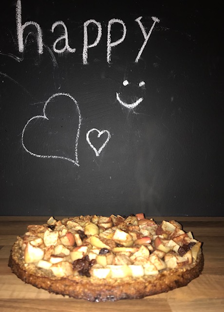 Appel in stukjes mengen met de kaneel (kaneel naar eigen smaak) en de rozijnen. Het mengsel nu boven op de kaneel bodem leggen. Vervolgens weer 10 min in de oven.